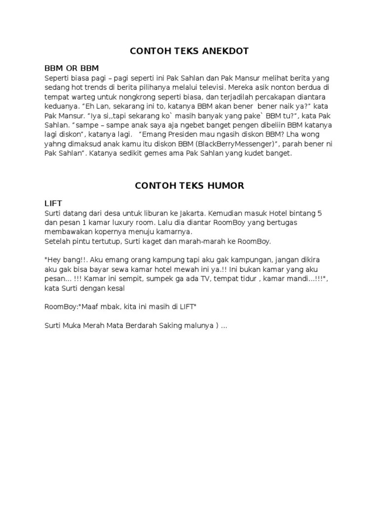 Teks anekdot berfungsi sindiran atau kritikan dengan sajian berbentuk humor atau lelucon. Anekdot biasanya mengangkat cerita tentang. Alkisah disebuah keluarga yang bahagia ada sepasang kaka beradik yang pergi untuk berkebun, namun . Secara umum teks anekdot lebih dikenal sebagai cerita yang lebih singkat dari cerpen. Teks anekdot adalah sebuah cerita singkat dan lucu atau menarik, yang mungkin menggambarkan kejadian .